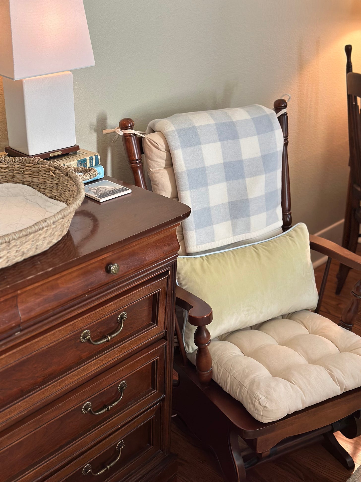 The only dilemma I ran into when thinking through how our routines would go with this baby was the fact we still use Kit’s beautiful rocker multiple times a day…to read in, to say good morning in, to settle her in for a nap and for bedtime. We are nowhere near prepared to not have a rocker in the nursery, especially given he will eventually go in there, too. So we made use of an old family heirloom my grandpa had offered up to me now three years ago, before any babies even. It belonged to his aunt and uncle, a beautiful Ethan Allen glider that fits perfectly to the side of the dresser we bought for $100 on the side of the road a few months ago. I ordered custom linen cushions off of Etsy, and then repurposed an old Chappy Wrap blanket and Pepper Home pillow that matches one in Kit’s crib, both in the most gorgeous, and surprisingly easy to clean, pear velvet fabric.