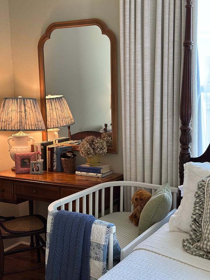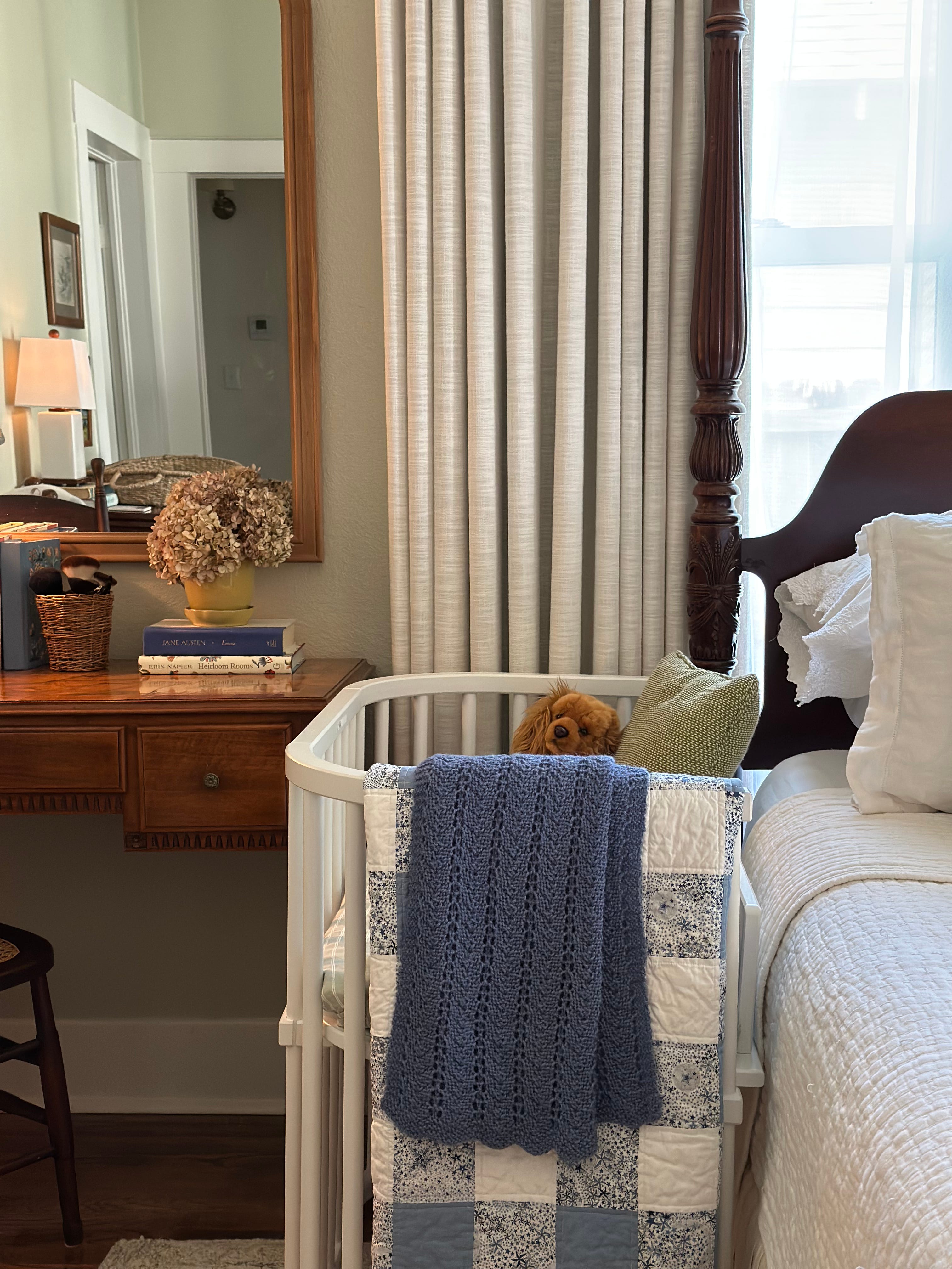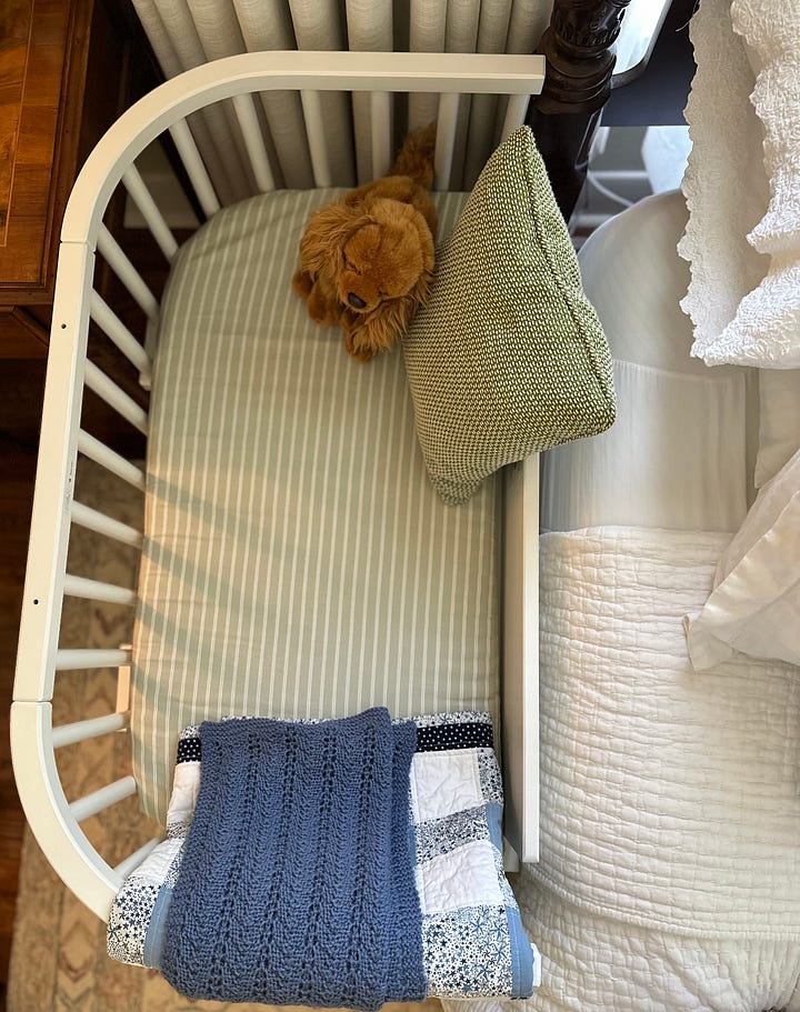 When Kit was born, we used one of the common baby registry bassinets, one that swiveled onto the bed for easy access, mesh siding, made of plastic. I felt like it was lopsided and entirely too bulky, and she would have outgrown it sooner than I would have outgrown wanting her beside me. So I pulled out my wallet and invested in the Babybay cosleeper bassinet, a purchase I never one time regretted, especially now, with another baby on the way. It made me feel closer to my baby and then, of course, like my room was pretty again, and not a constant reminder of newly postpartum nighttimes. I use king-sized pillowcases, picking out a pretty sage striped for his bed, as sheets, and love to drape blankets on the end. This quilt was a one-of-a-kind from Etsy, made from starry and gingham Liberty fabric (linking some others I loved here, here, and especially here). The gorgeous knitted baby blanket on top is a gift from my grandmother.