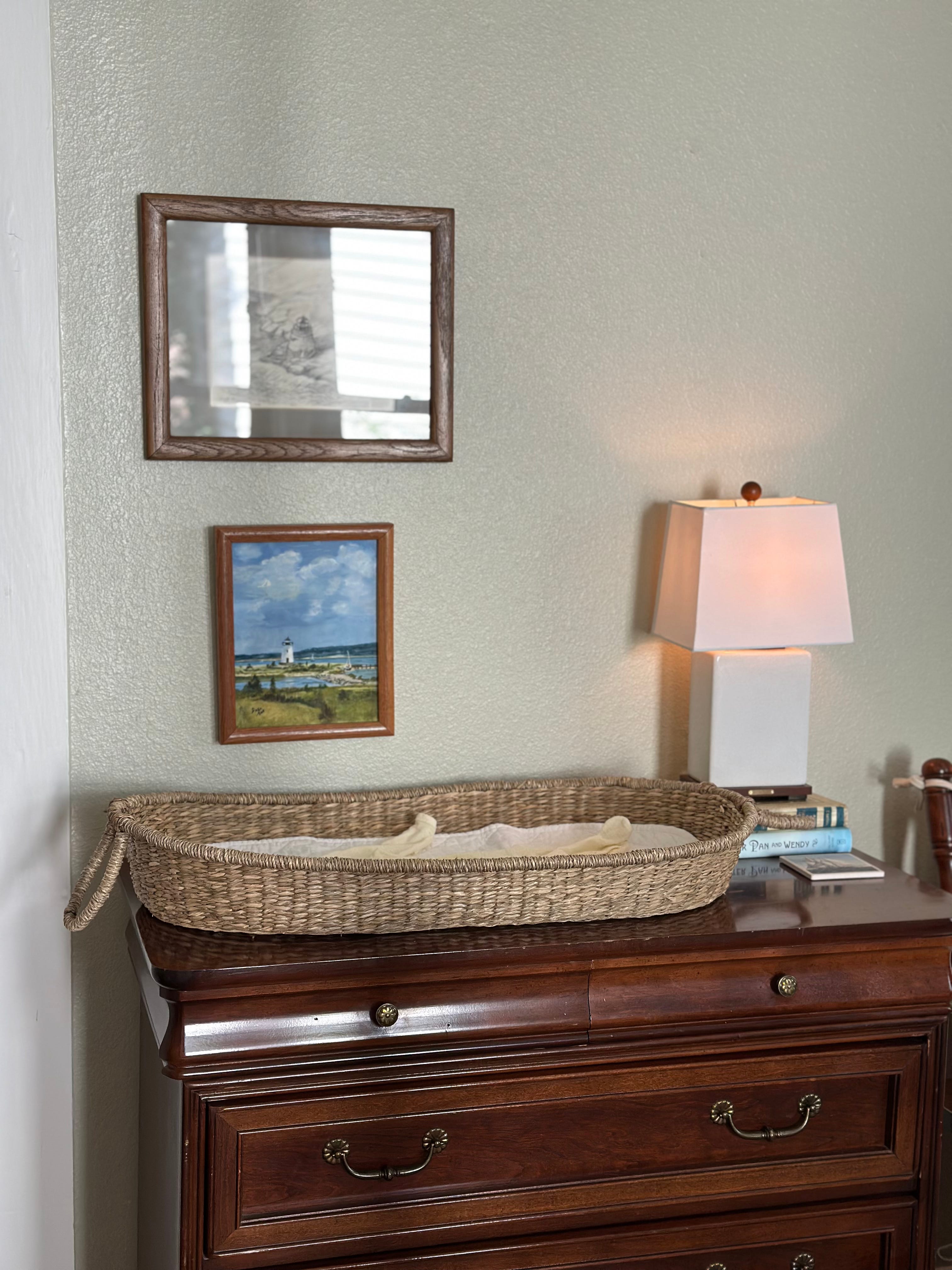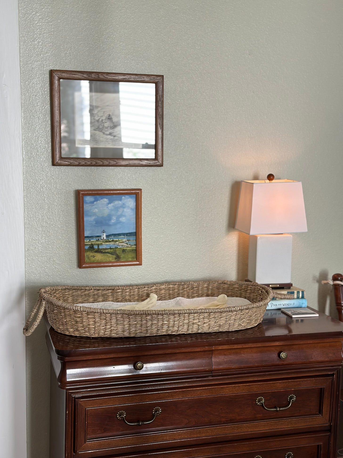 On the dresser, I ordered a seagrass changing basket and found one of my favorite lamps I’ve ever owned (my first a blue and white floral I bought for our very first home together) on the bottom shelf at Homegoods, a tiny cream Ralph Lauren that holds a 7.5 watt lightbulb so I can leave it on all night in the beginning, when the nighttime makes me feel anxious and I need to watch him sleep instead of sleep myself.