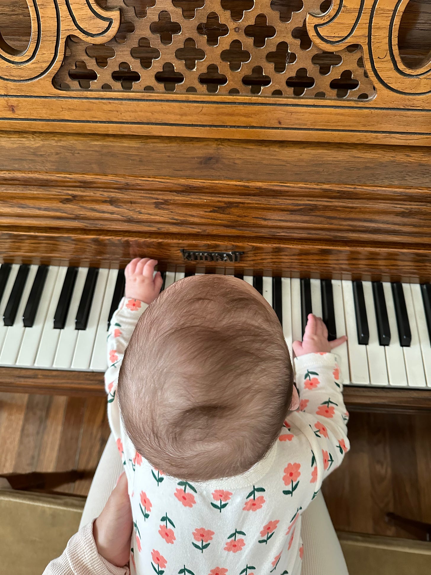 Every day this week, I’ve taken Kit and sat on the bench, nestled her little bottom in my lap, her knees under the keys, and pecked away. Remembering what sharps and flats are in each key, how to complete scales, which fingers to move on to get to the upper octaves, the third or the fourth, seeing how well I can sight read. I played for over a decade, taking lessons from a kind older woman with a grand piano in her front sitting room and then from our church pianist, the sanctuary empty and dark except for the piano light. It only makes sense how ingrained that teaching would be in my mind, my fingers, how quickly it can all come flooding back. I plan on going to my parent’s house in the next few days to pilfer through old sheet music, something to practice on so I can prove to Price I’m better than him, too.